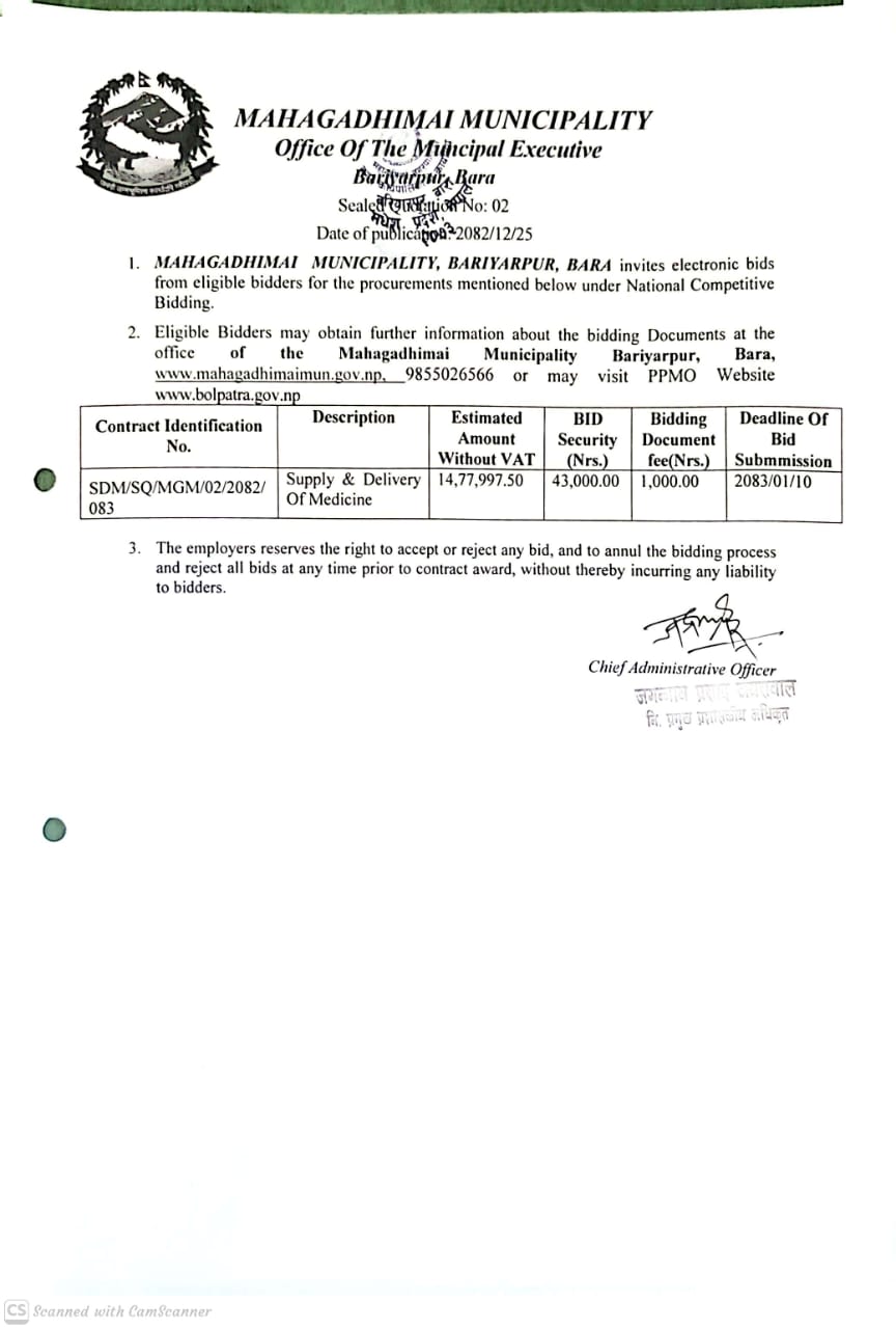 स्वास्थ्य औषधीको सम्बन्धि बोलपत्र सूचना ।