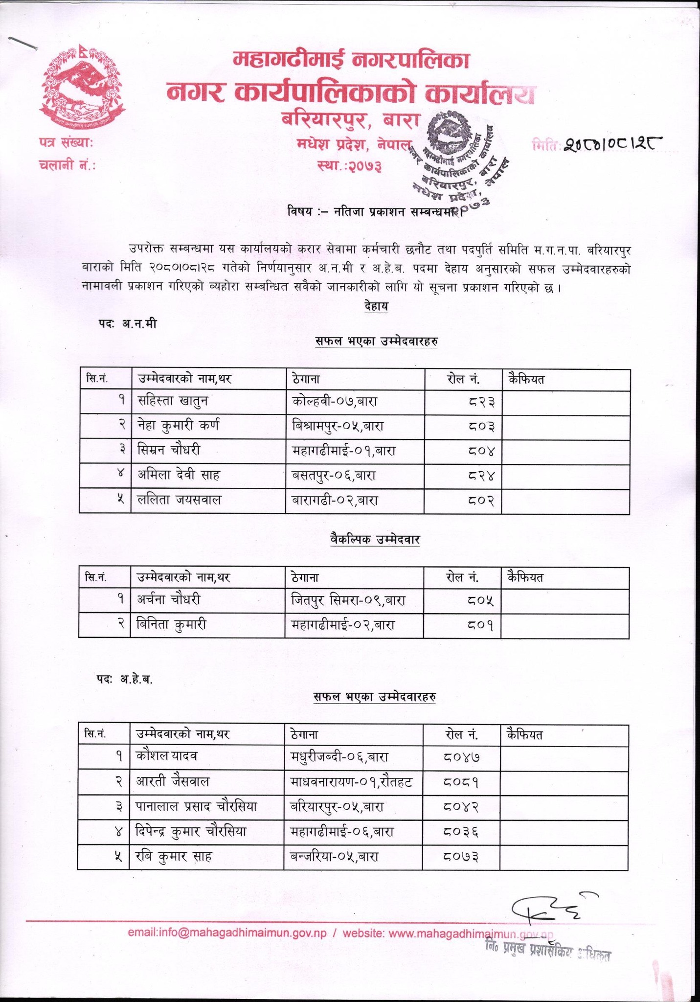 अ.हे.व. र अ.न.मि. पदको सफल उम्मेदवारहरुको नतिजा प्रकाशन सम्वन्धमा।
