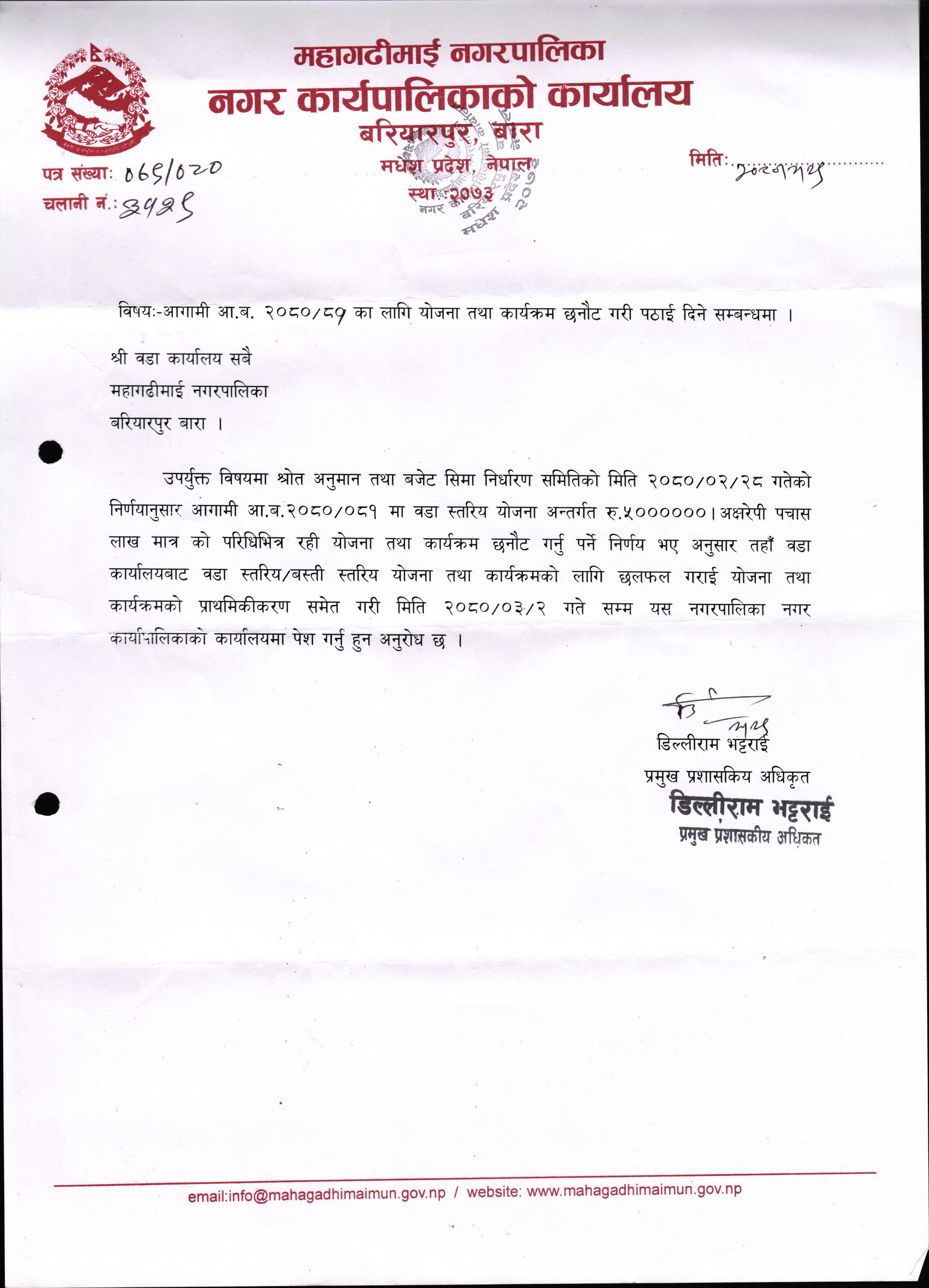 मितिः२०७५।०३|३२ गते योजना छनोट बजेट सिलिङ्ग वडाहरुमा पठाइएको छ।