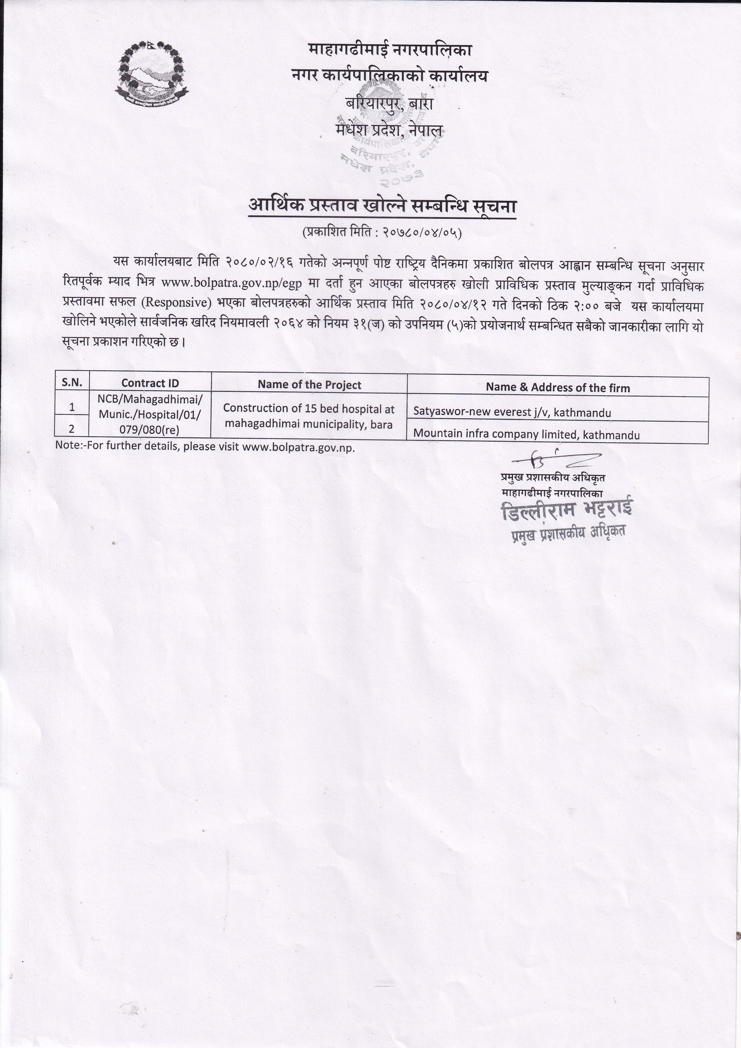 आर्थिक प्रस्ताव खोल्ने सम्बन्धि सूचना ।