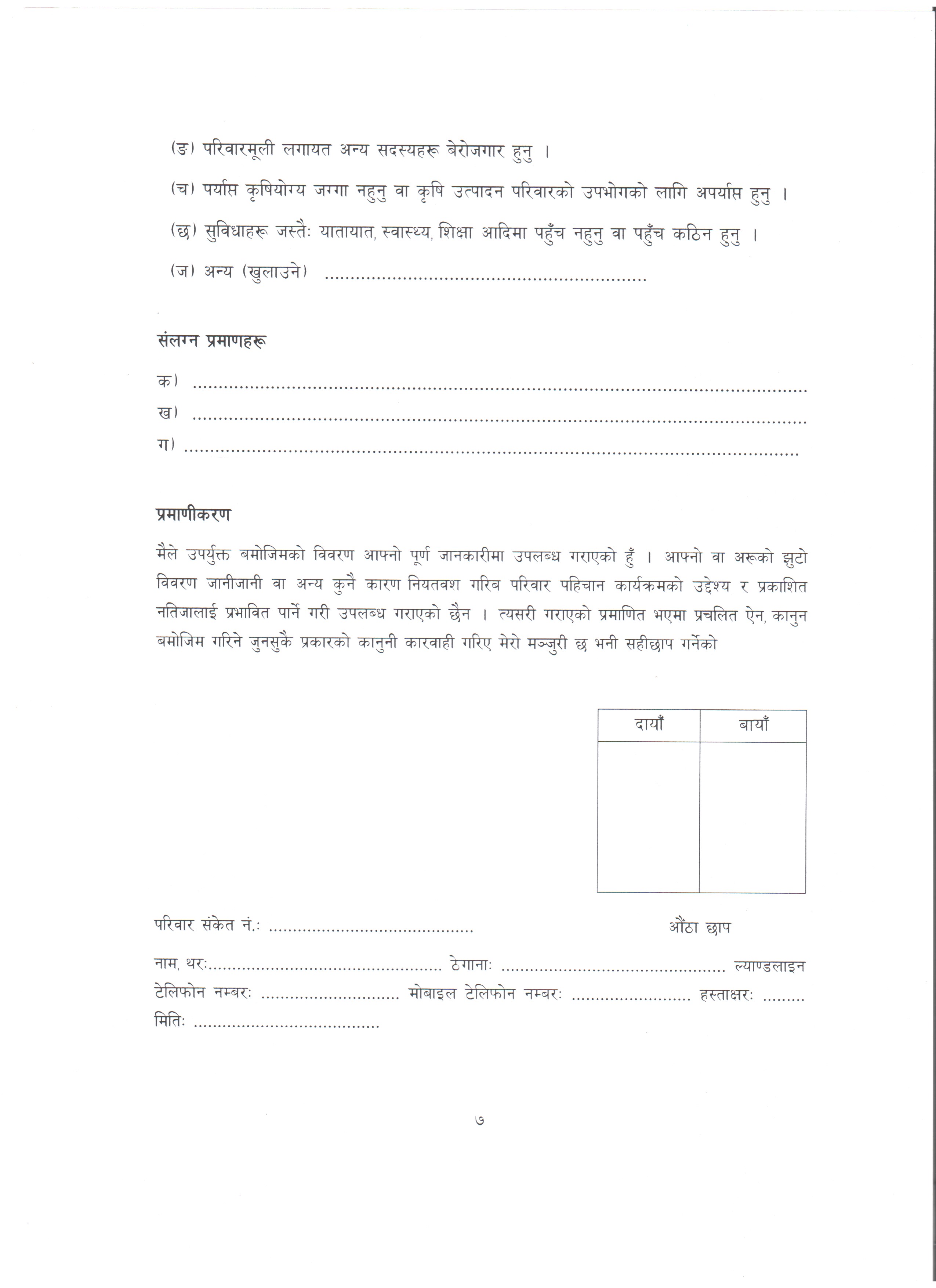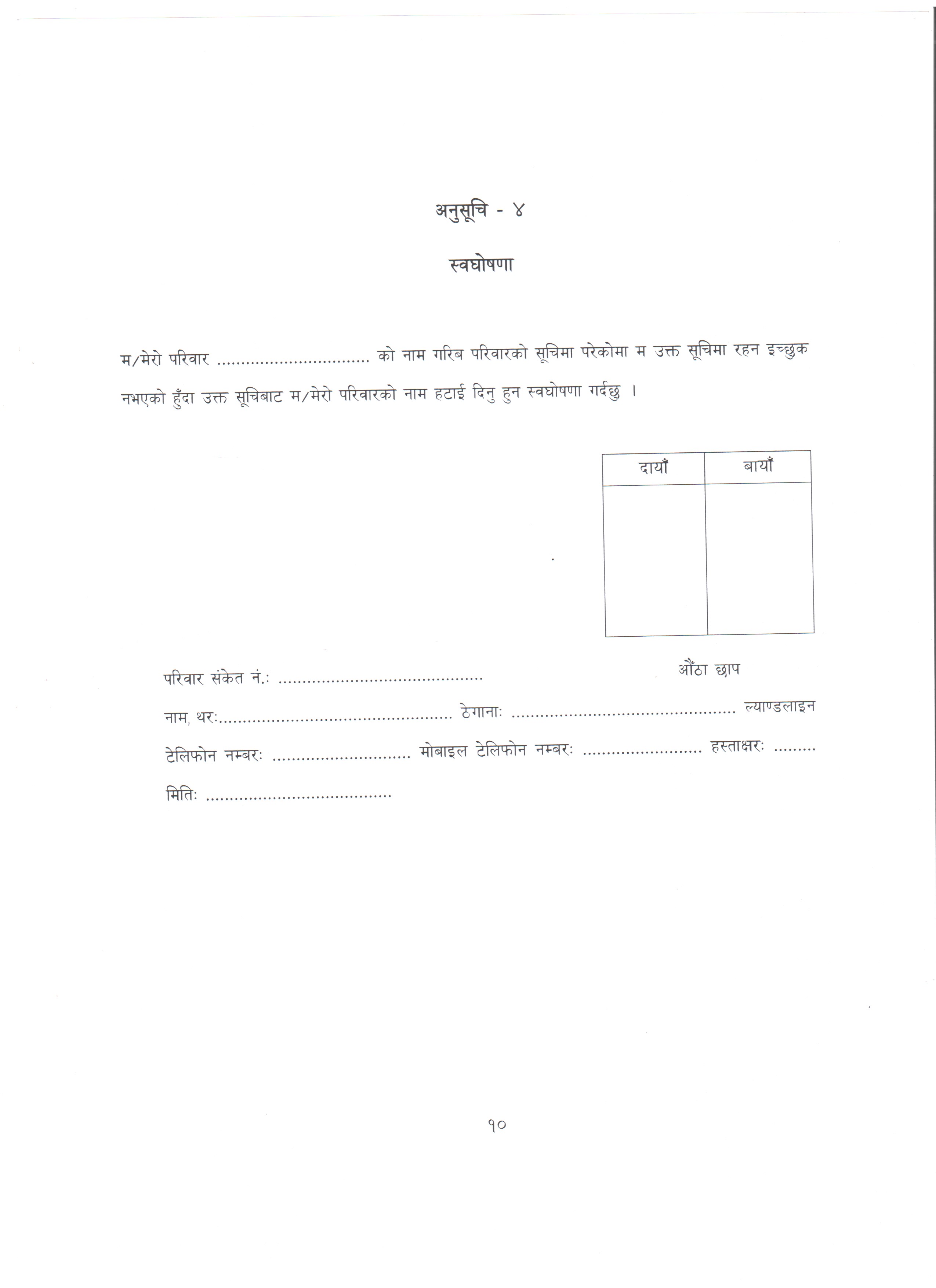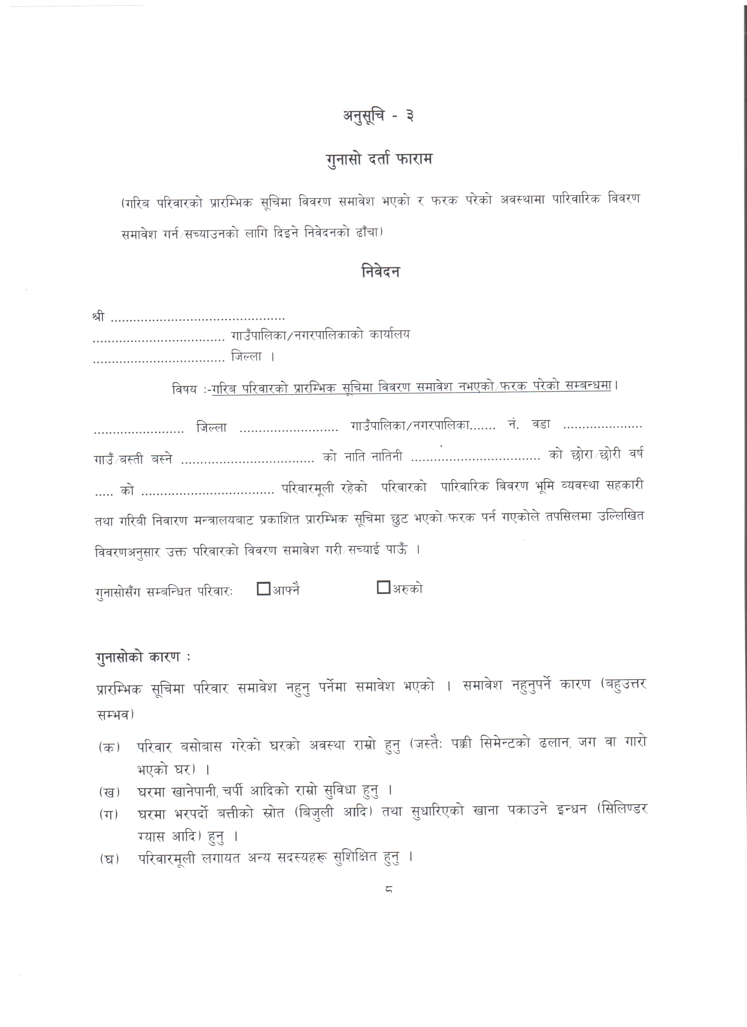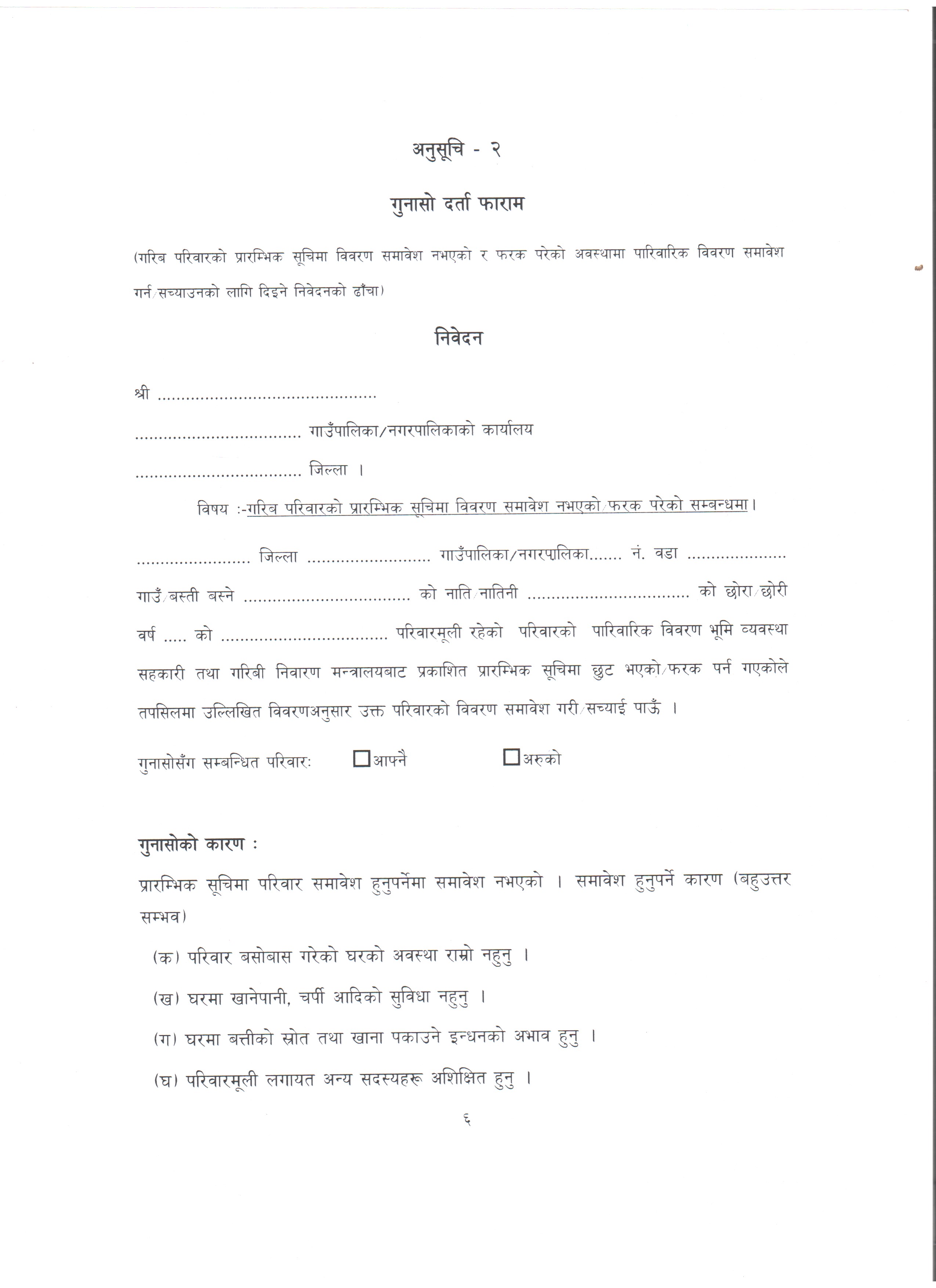 गरीब परिवारको प्रारम्भिक सूची उपर गुनासो दर्ता गर्न चाहिने आवश्यक अनुसूचीहरू।