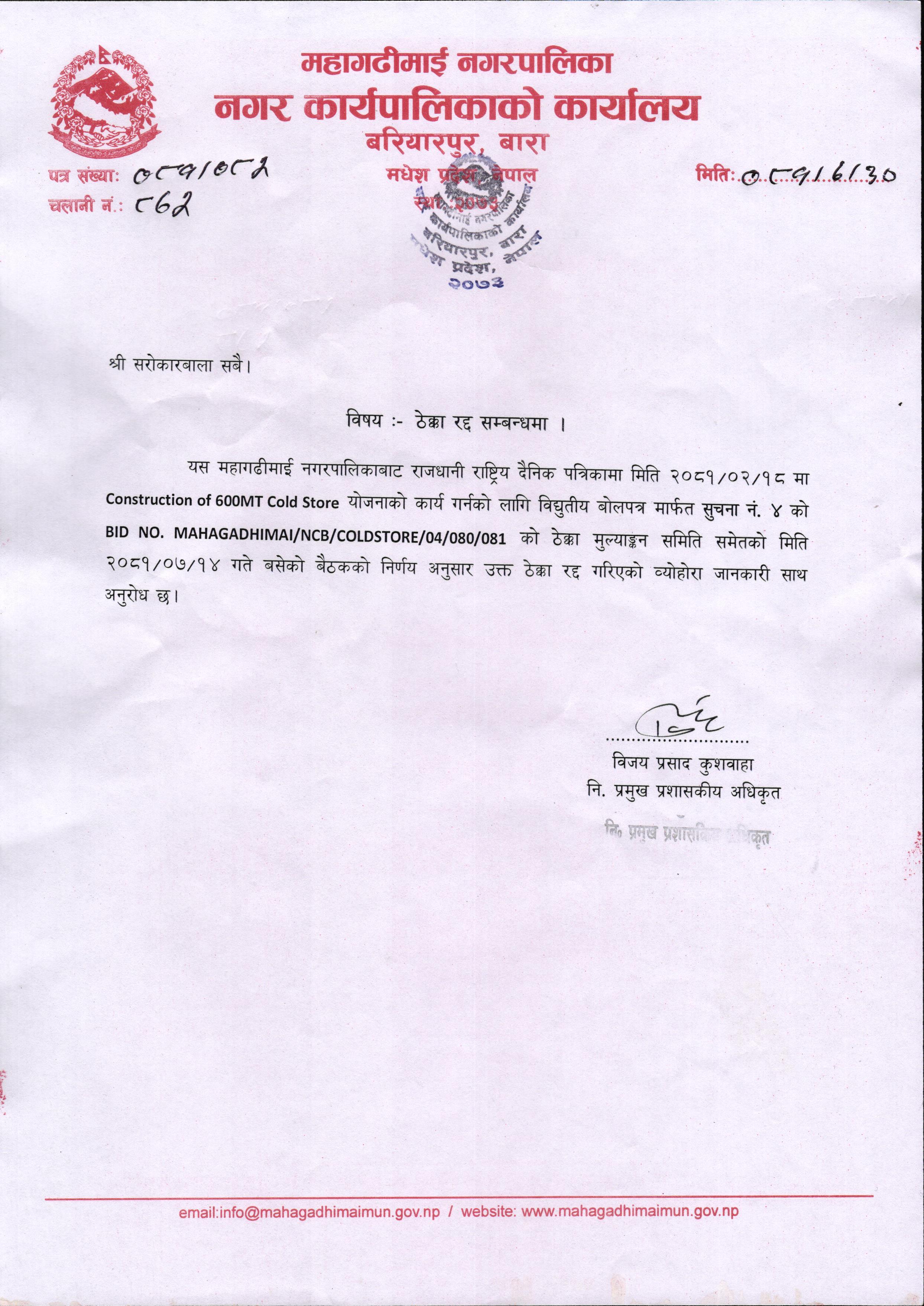 600 MT क्षमताको शित भण्डार गृह निर्माणको लागी बोलपत्र अह्वान सम्बन्धि सूचना।
