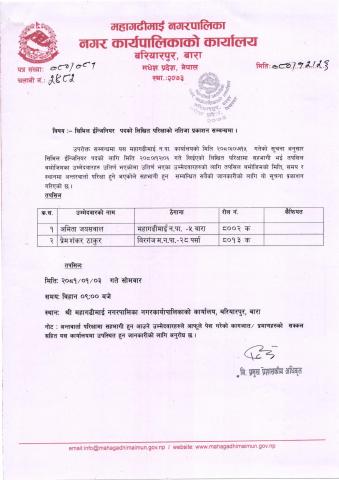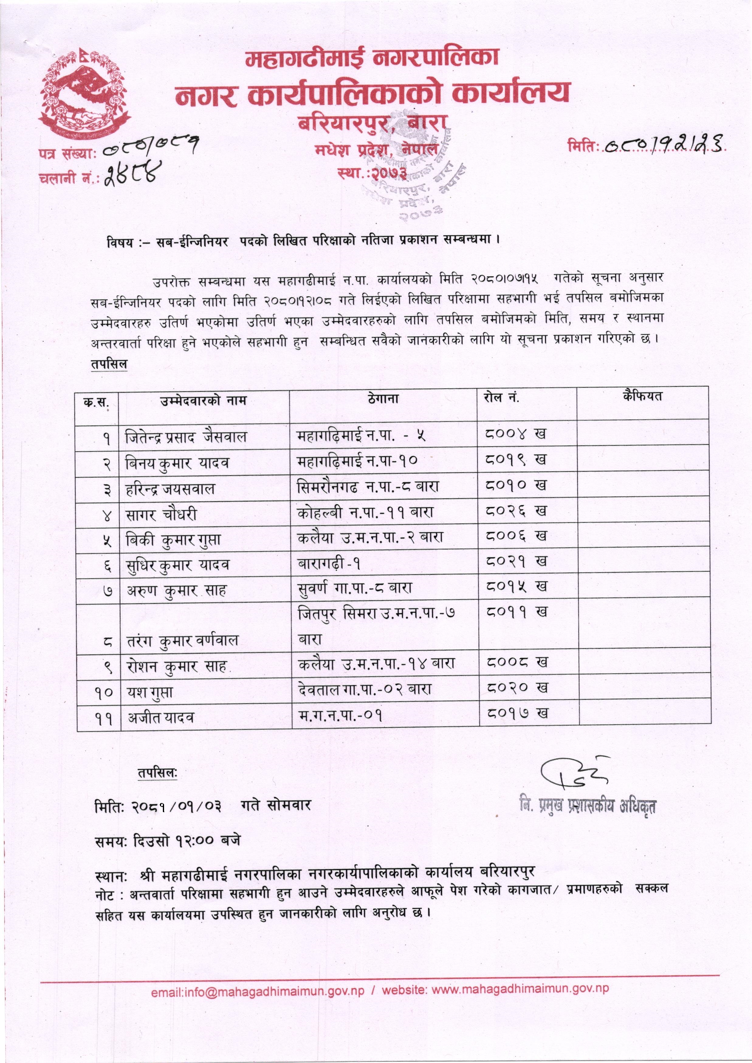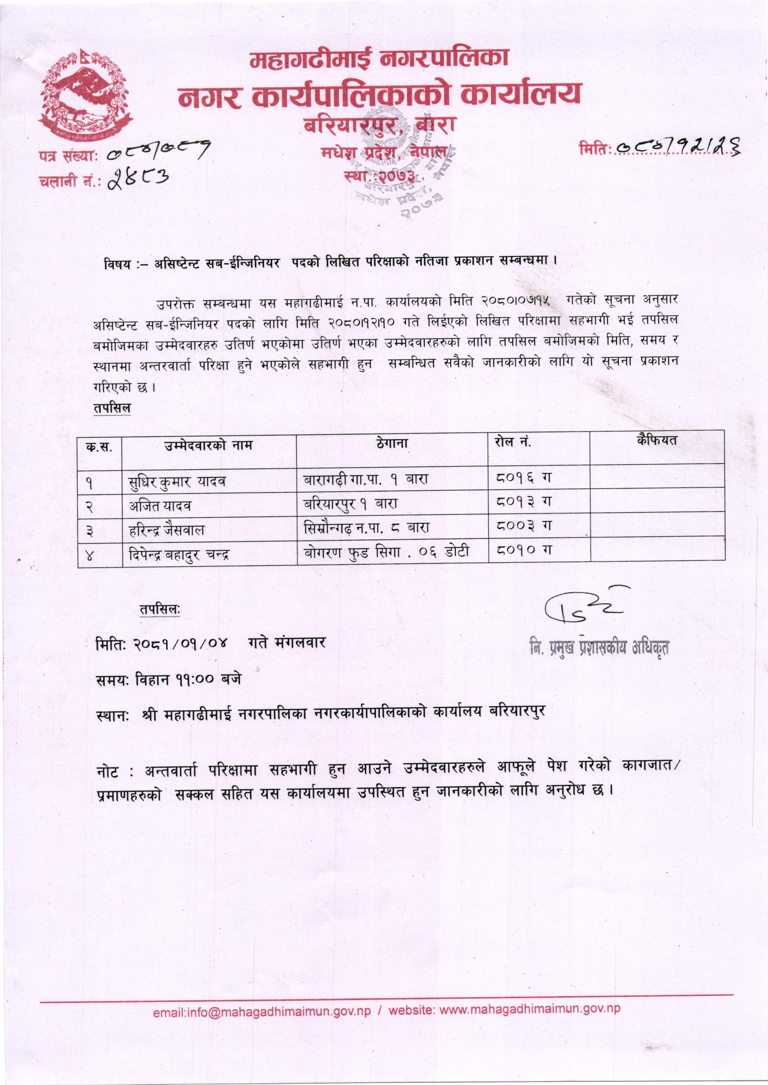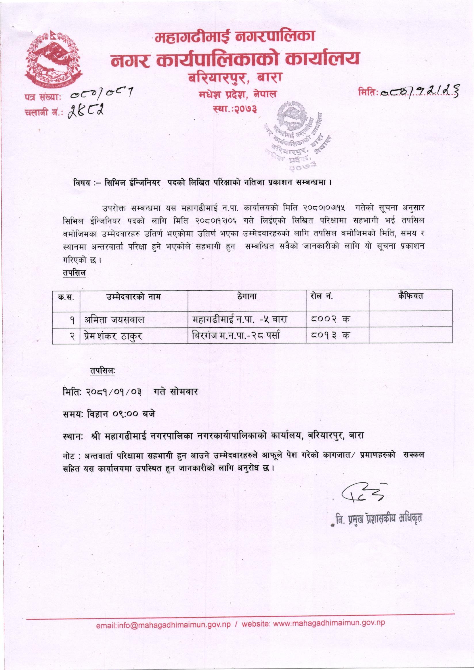 सिभिल ईन्जिनियर, सब ईन्जिनियर र असिष्टेन्ट सब ईन्जिनियर पदको लिखित परीक्षाको नतिजा सम्बन्धमा।