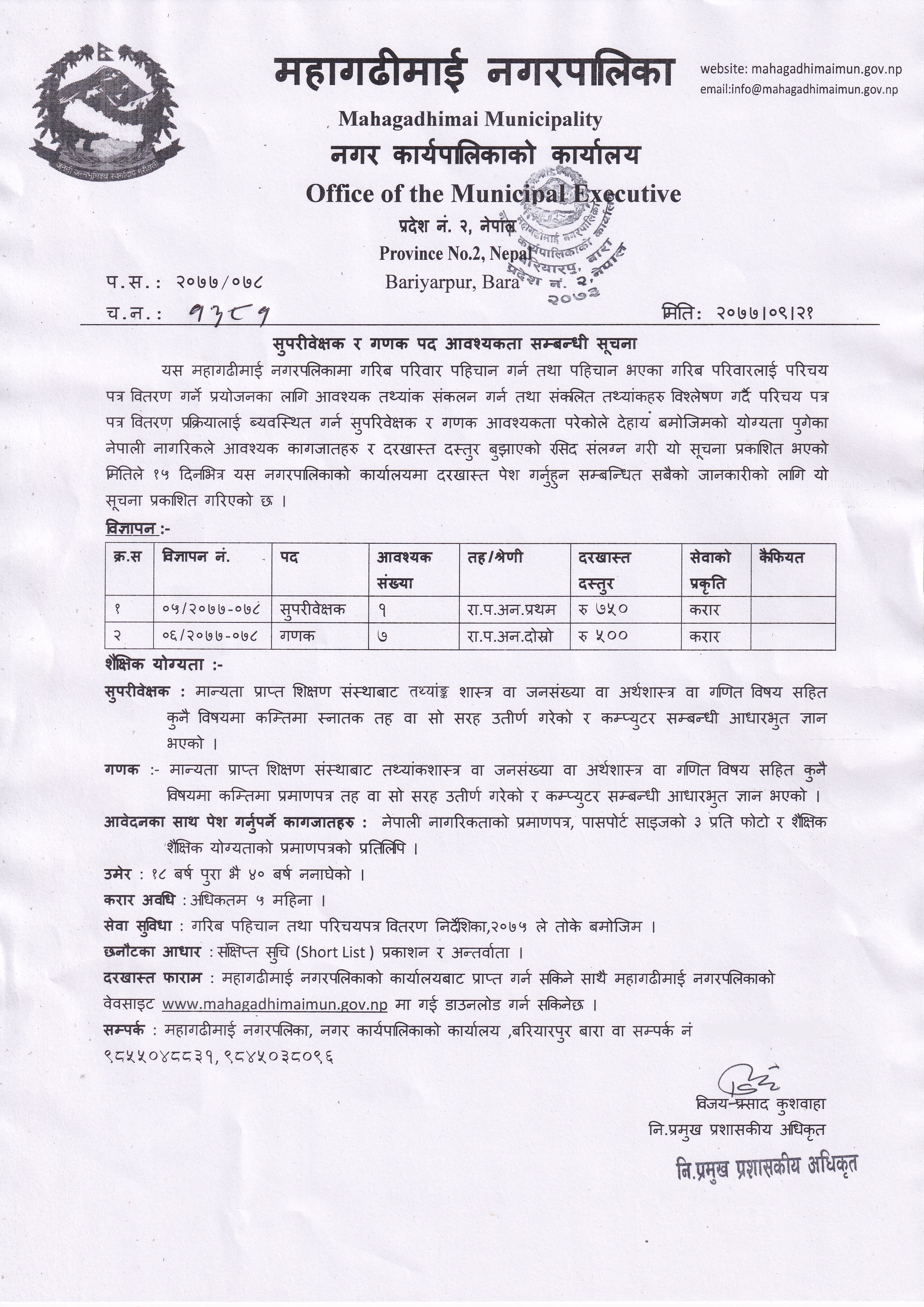 » सूपरीवेक्षक र गणक पद आवश्यकता सम्बन्धि सूचना।