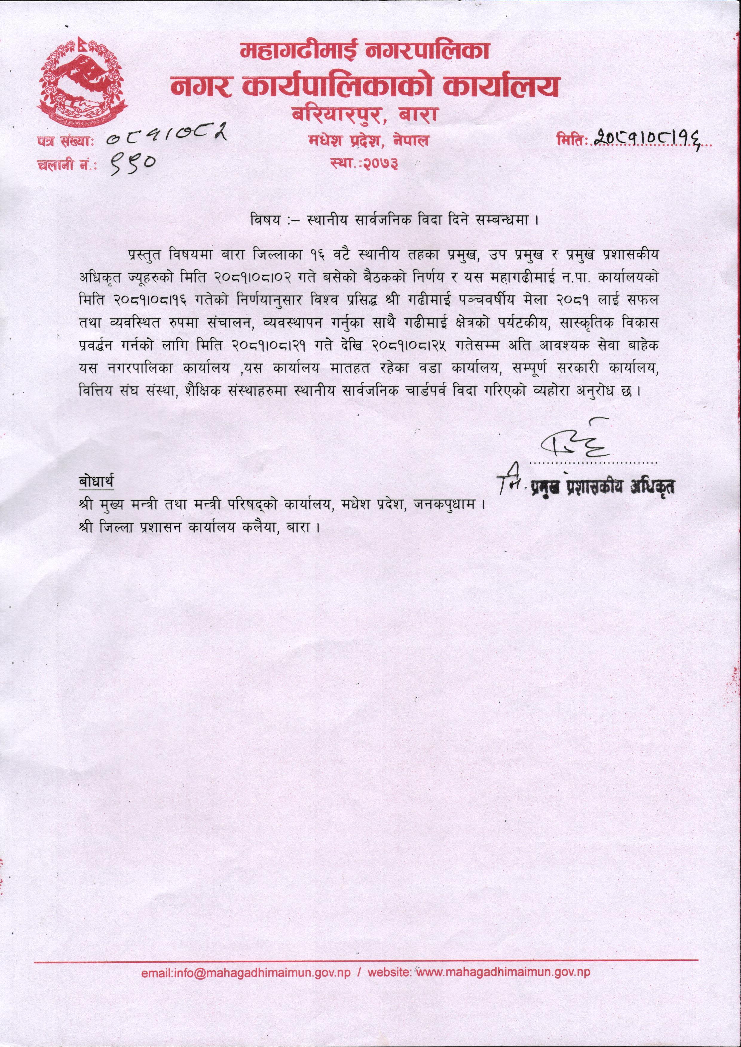 स्थानीय सार्वजनिक विदा दिने सम्बन्धमा ।