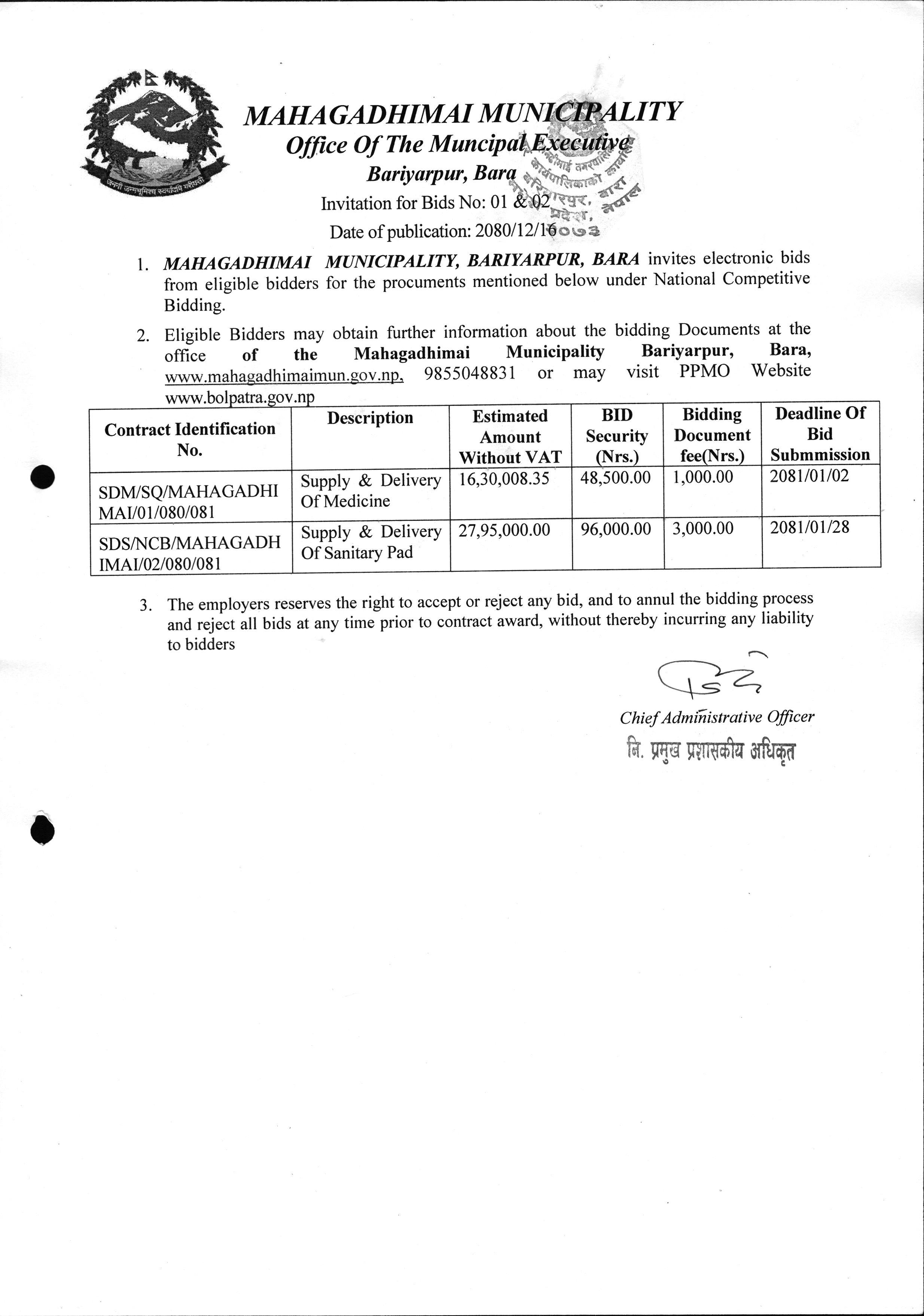 औषधि र सेन्टरी पयाड को आपूर्ति, वितरण र ढुवानी को लागी बोलपत्र को लागी निमन्त्रणा।