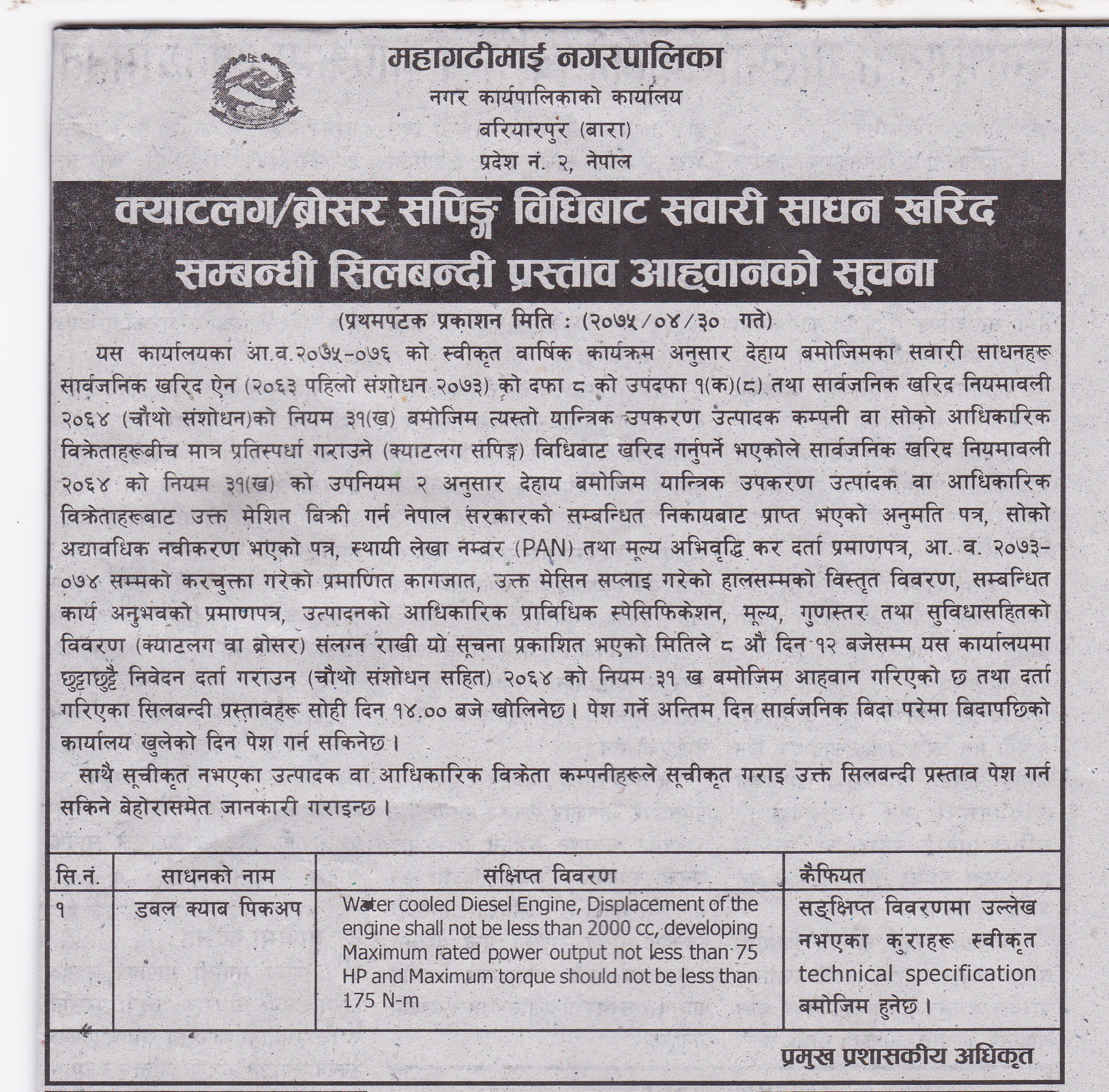 » क्याटलग/ब्रोसर सपिङ्ग विधिवाट सवारी साधन खरीद सम्बन्धि सिलबन्दी प्रस्ताव आह्वानको सूचना
