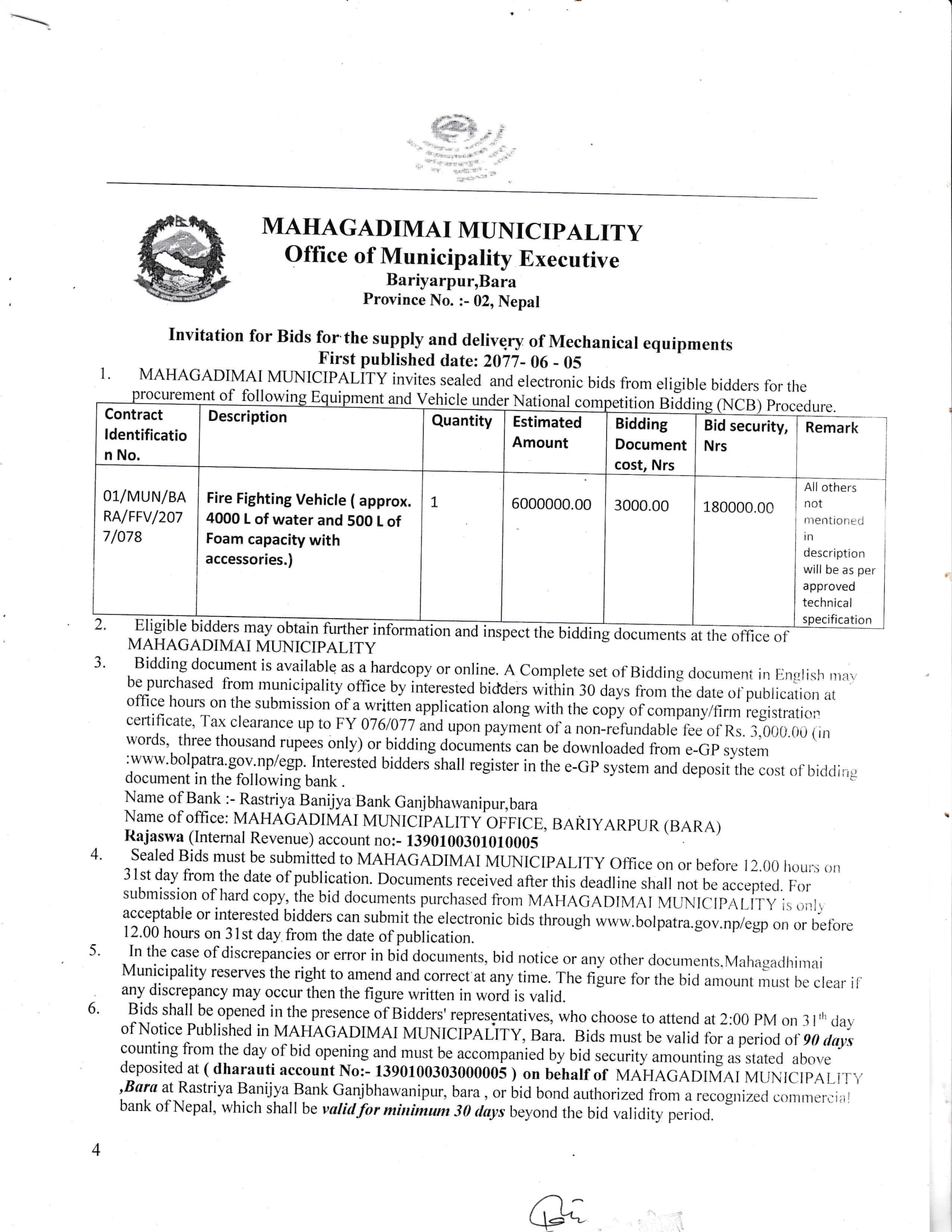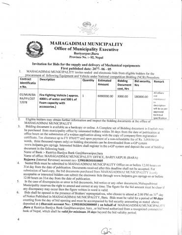 दमकल खरिद सम्बन्धि बोलपत्र अव्हान।