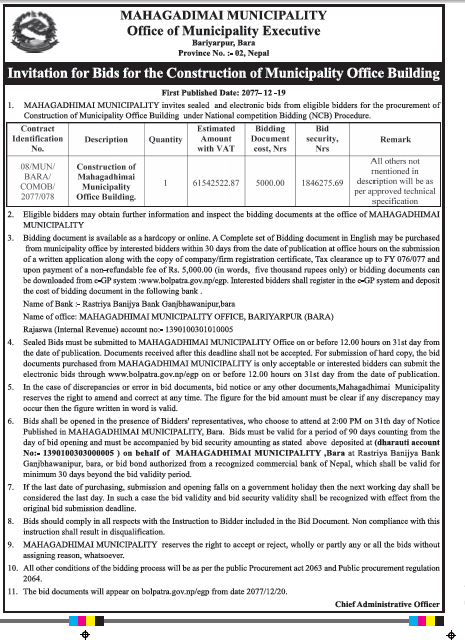 » नगरपालिका कार्यालय भवन निर्माणको लागि बोलपत्रको लागि आमन्त्रित ।