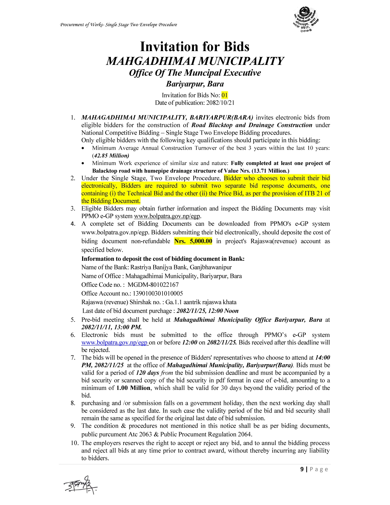 बोलपत्र आह्वान सम्बन्धी सूचना।
