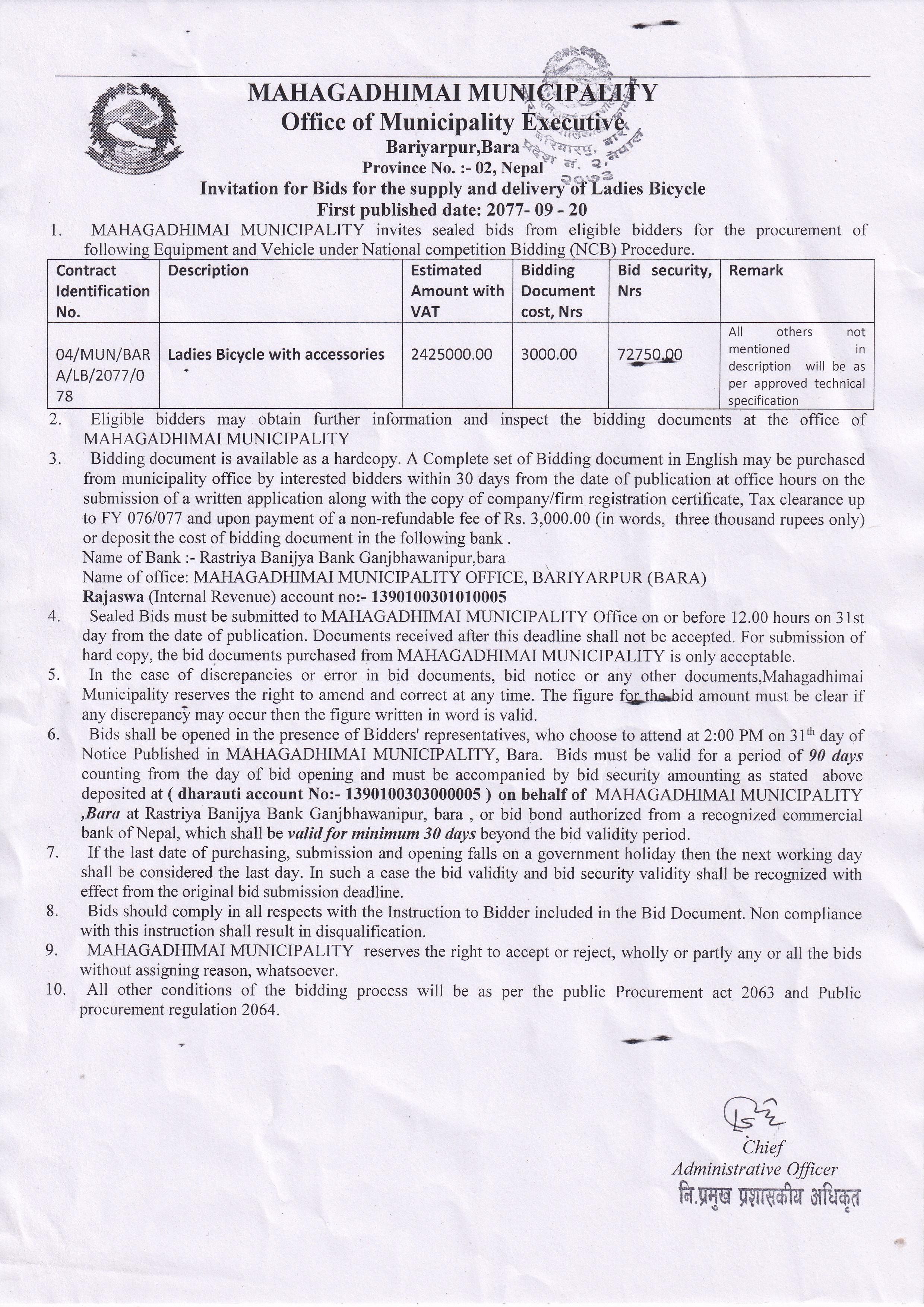 सामान सहित महिला साइकल खरिद सम्बन्धि बोलपत्र अव्हान।