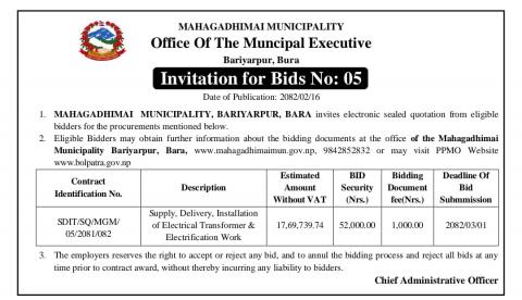 बोलपत्र आह्वान सम्बन्धी सूचना।